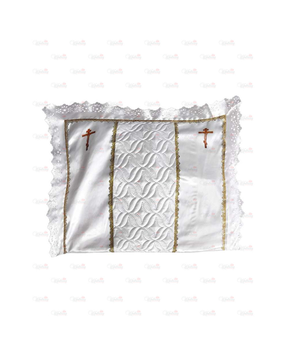 Подушка "Крест" украшена ритуальным кружевом по периметру. Изготовлена из атласа гладкого, комбинированного с атласной термостёжкой (белого или золотого цвета на выбор заказчика). В месте соединения кружева атласного с основным изделием она украшена золотым ритуальным кружевом. Верхние углы украшены фотопечатью с изображениями Распятия. В нижней части изделия имеется замок-молния.