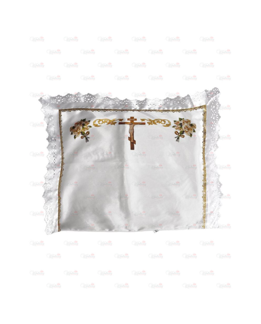 Подушка "Распятие и розы" украшена ритуальным полиэфирным кружевом по периметру. Изготовлена из полиэфирной ткани, украшена изображениями Распятия и букетов роз. В месте соединения кружева внешнего с основным изделием она украшена золотой узкой кружевной лентой. В нижней части изделия имеется замок-молния.