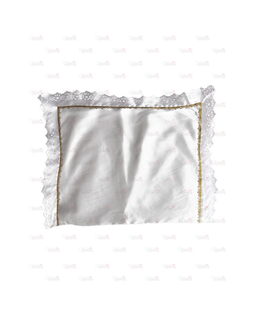 Подушка украшена кружевом по периметру. Изготовлена из гладкого атласа. В месте соединения кружева с основным полотном украшена золотой ритуальной кружевной лентой. В нижней части изделия имеется замок-молния.