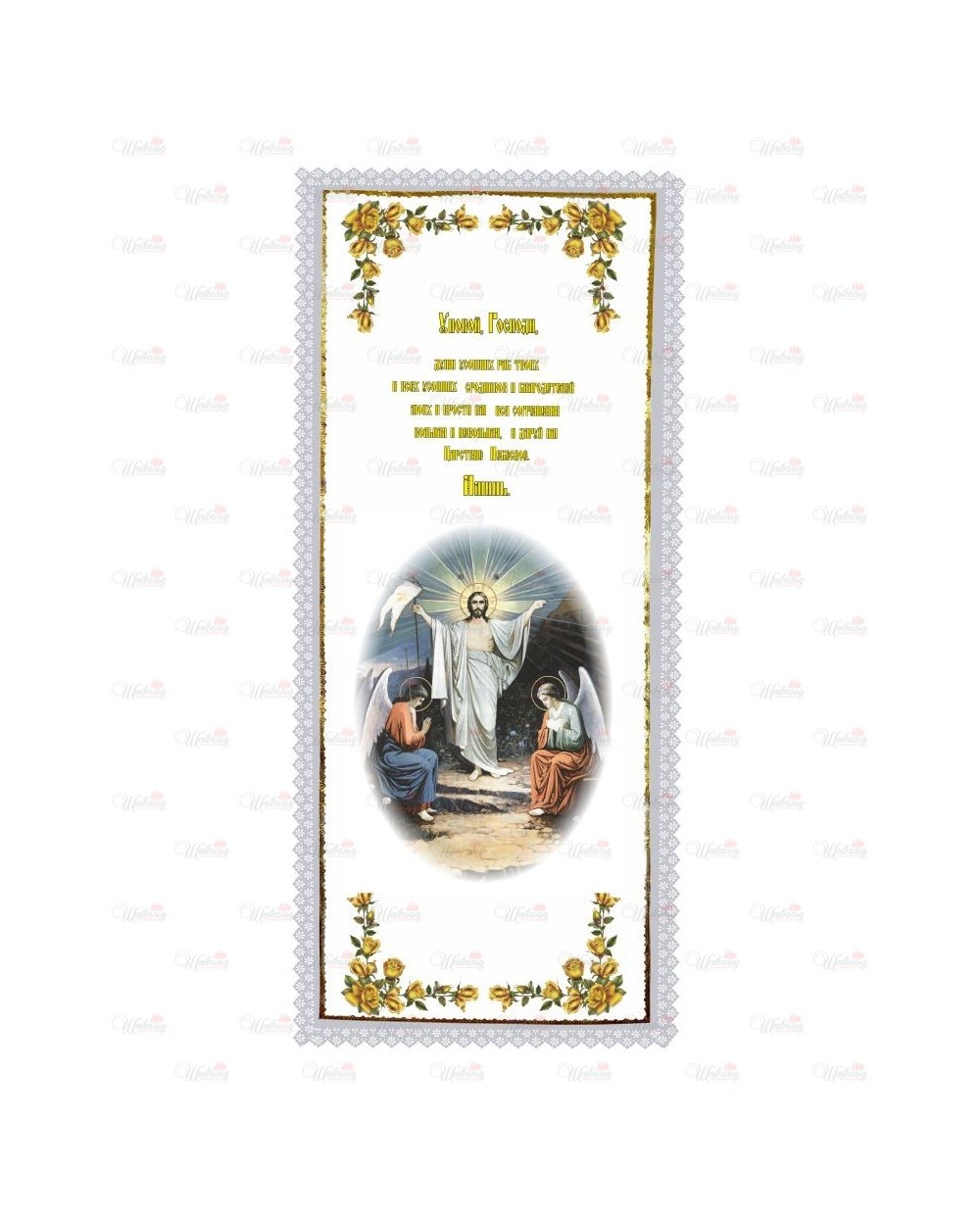 Атласное покрывало, отделанное по периметру кружевом с золотой лентой. На средней части размещено изображение Воскрешения Иисуса и молитвы. По углам размещены букеты цветов.