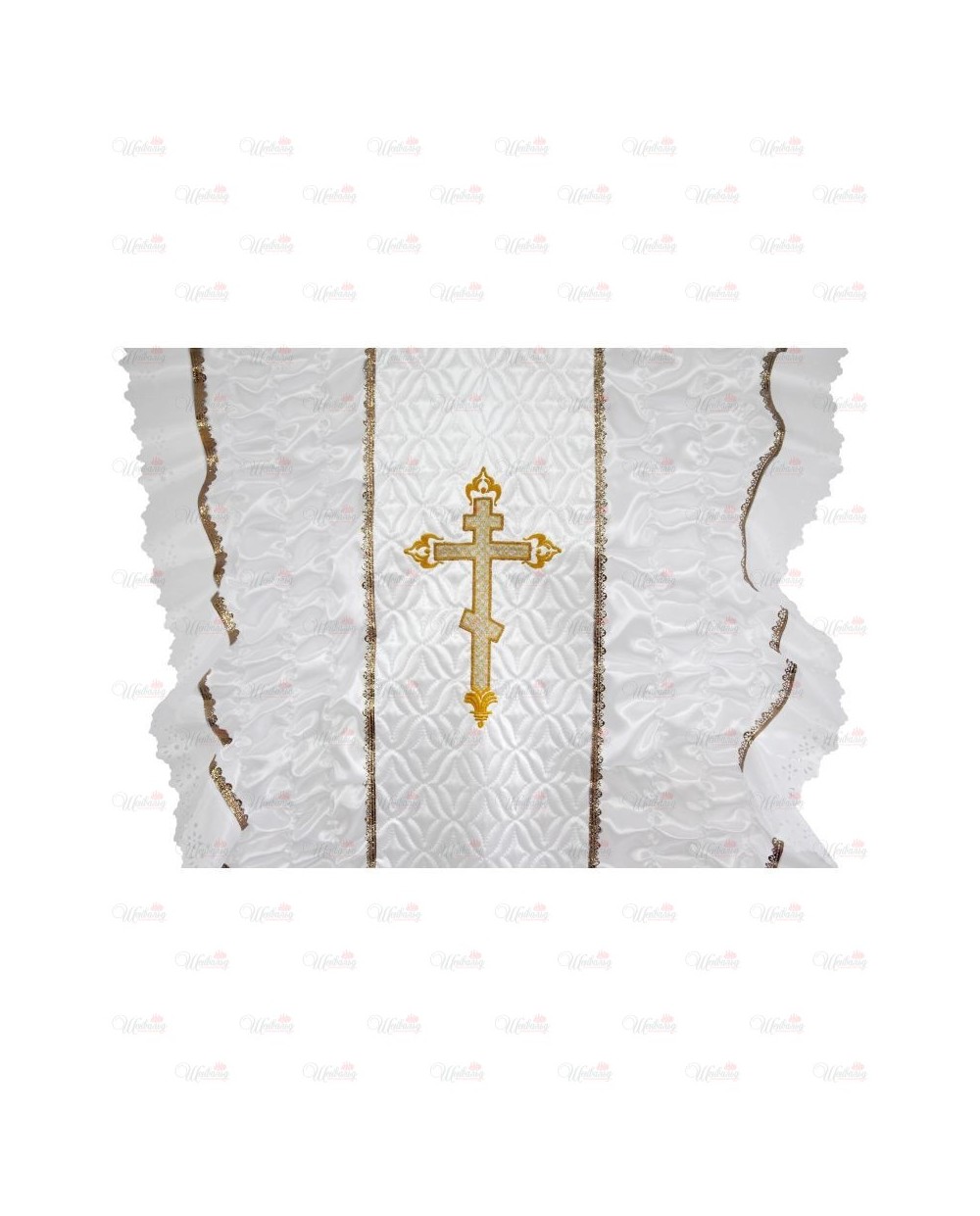 Комбинированное покрывало, отделанное по периметру кружевом с золотой лентой. На средней части размещен крест.