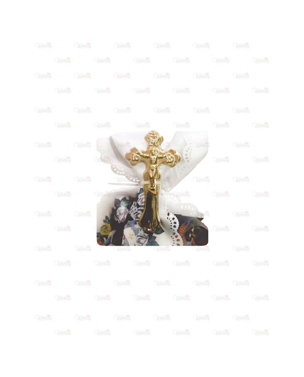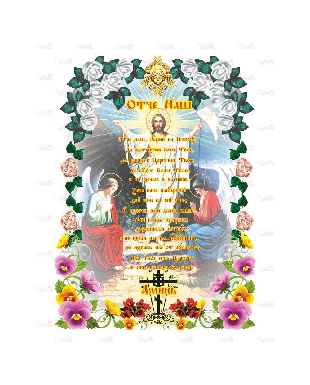 Полотенце ритуальное "Молитва об усопших" модель 1 изготовлено из атласной ткани, отделанно по периметру кружевом и золотой лентой по торцам. На рушник симметрично нанесены два изображения с молитвами. Все изделия комплектуются золотым крестиком и стяжкой для крепления к кресту. Возможно изготовление из полиэфирной ткани или габардина.