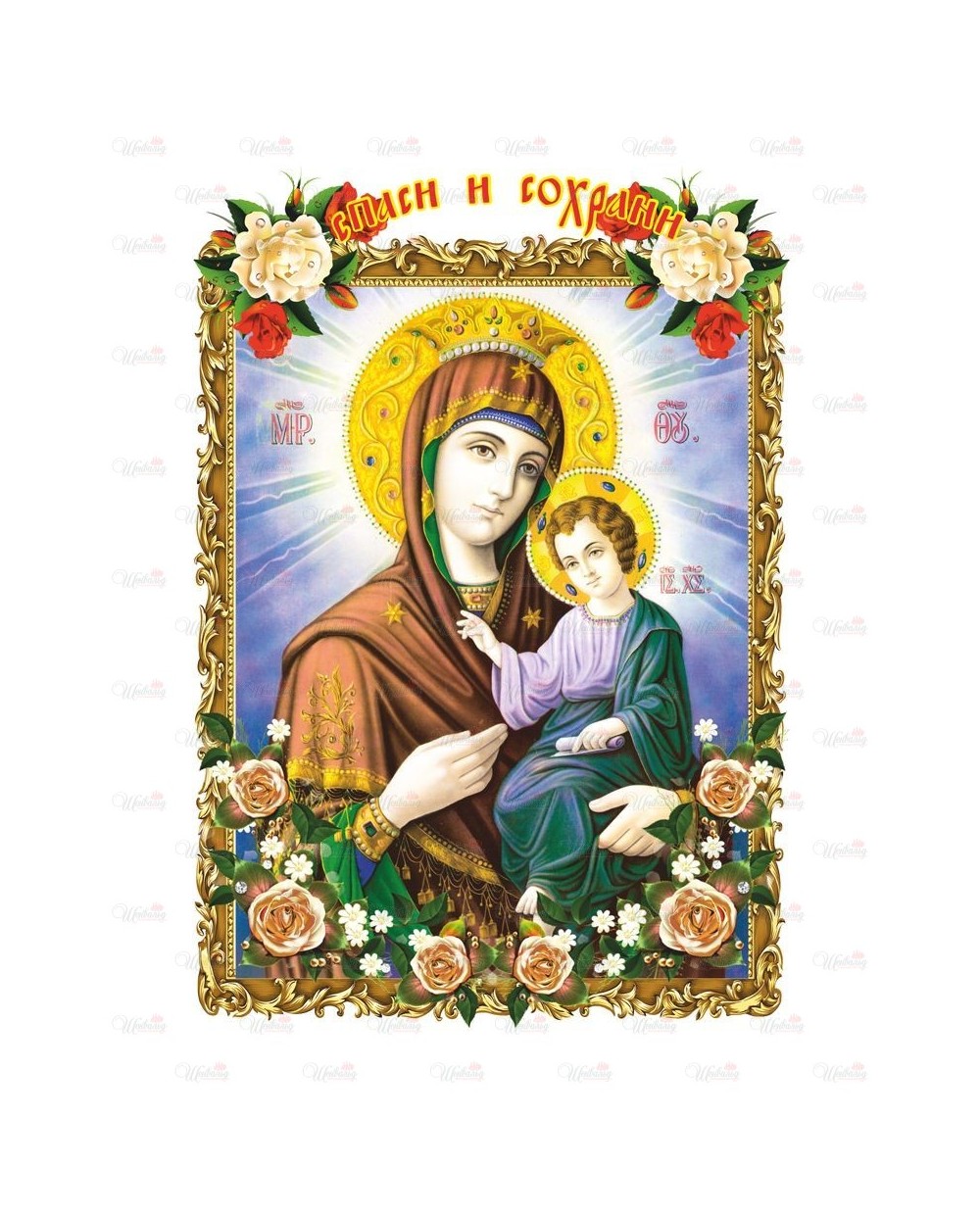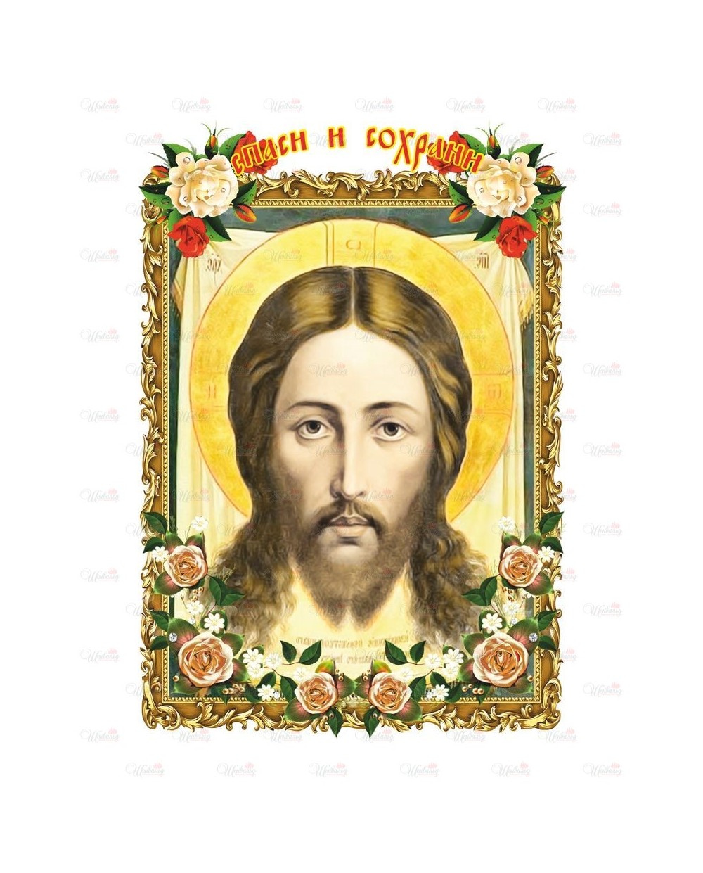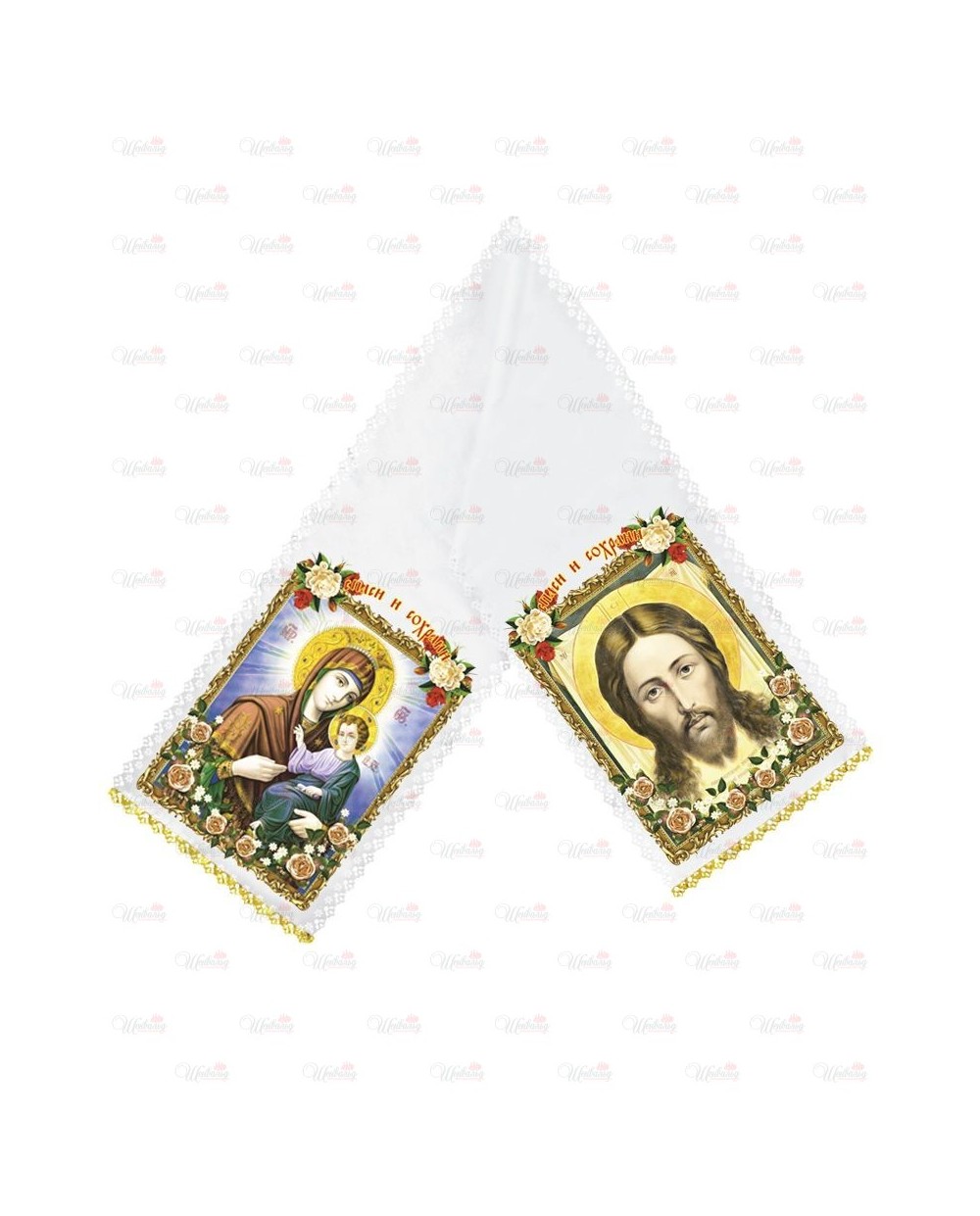 Полотенце ритуальное "Молитва Спаси и Сохрани" модель 4 изготовлено из атласной ткани, отделанно по периметру кружевом и золотой лентой по торцам. На рушник симметрично нанесены два изображения с молитвами. Все изделия комплектуются золотым крестиком и стяжкой для крепления к кресту. Возможно изготовление из полиэфирной ткани или габардина.